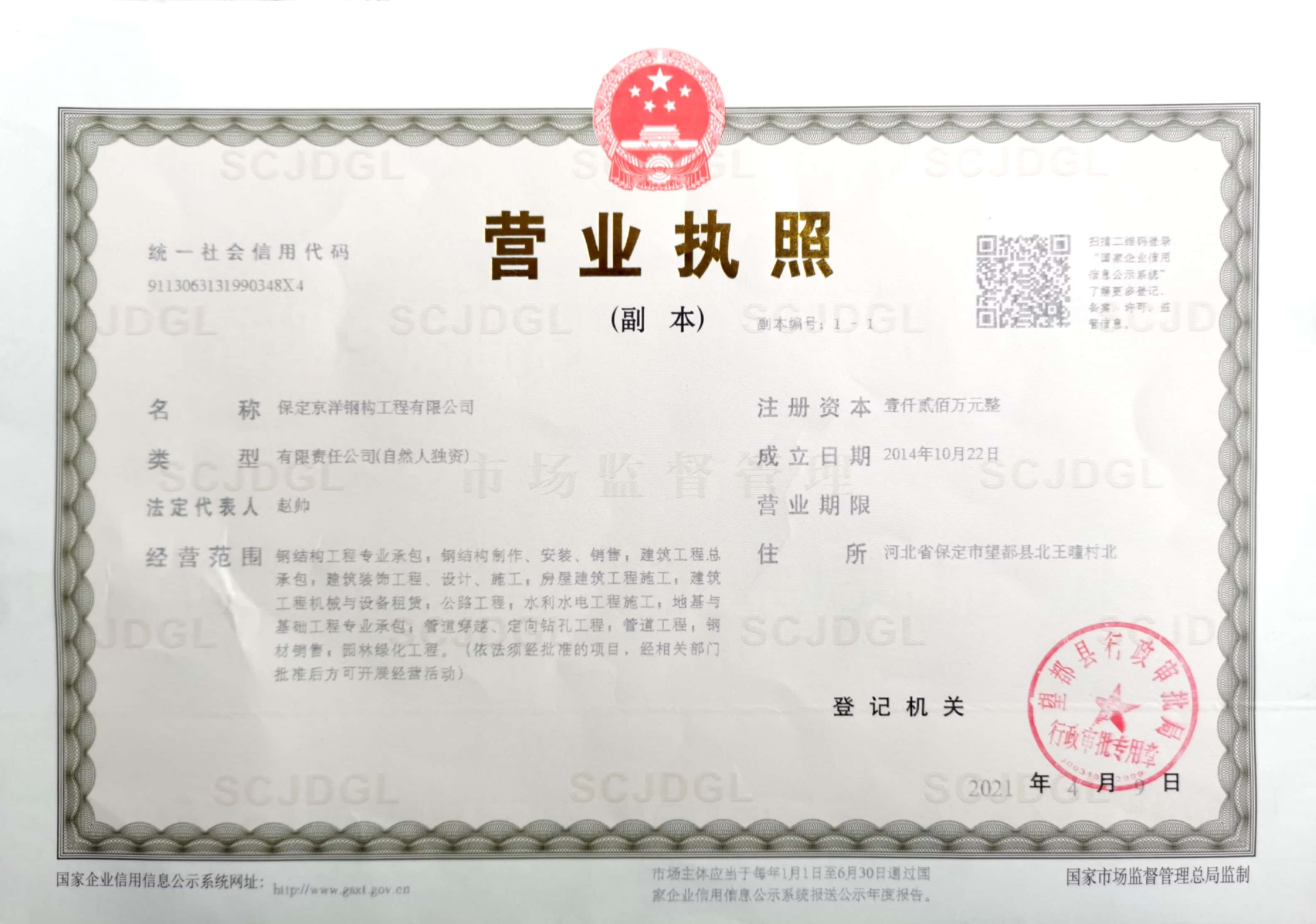 保定京洋鋼構(gòu)工程有限公司位于千年古縣望都。望都縣處于京津冀核心區(qū),是對接京津的交通要塞。距北京180公里,天津170公里,石家莊機(jī)場70公里。京石高鐵、京廣鐵路、京港澳高速、107國道四條交通大動脈縱貫全縣。圍繞望都南北各一座高鐵站,定州站(30公里)和保定站(35公里)。京昆高速、保阜高速均有連接線,四條省級公路縱橫交錯,交通便捷。